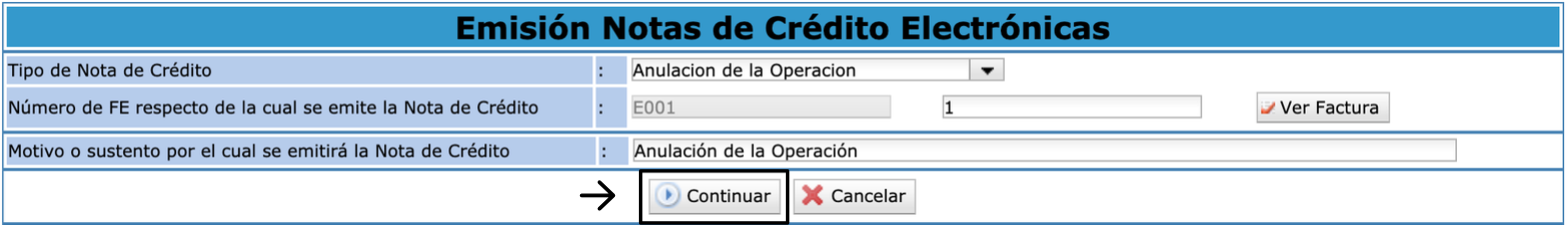 En motivo podemos colocar lo mismo que el Tipo de Nota de Crédito, luego da clic en Continuar.