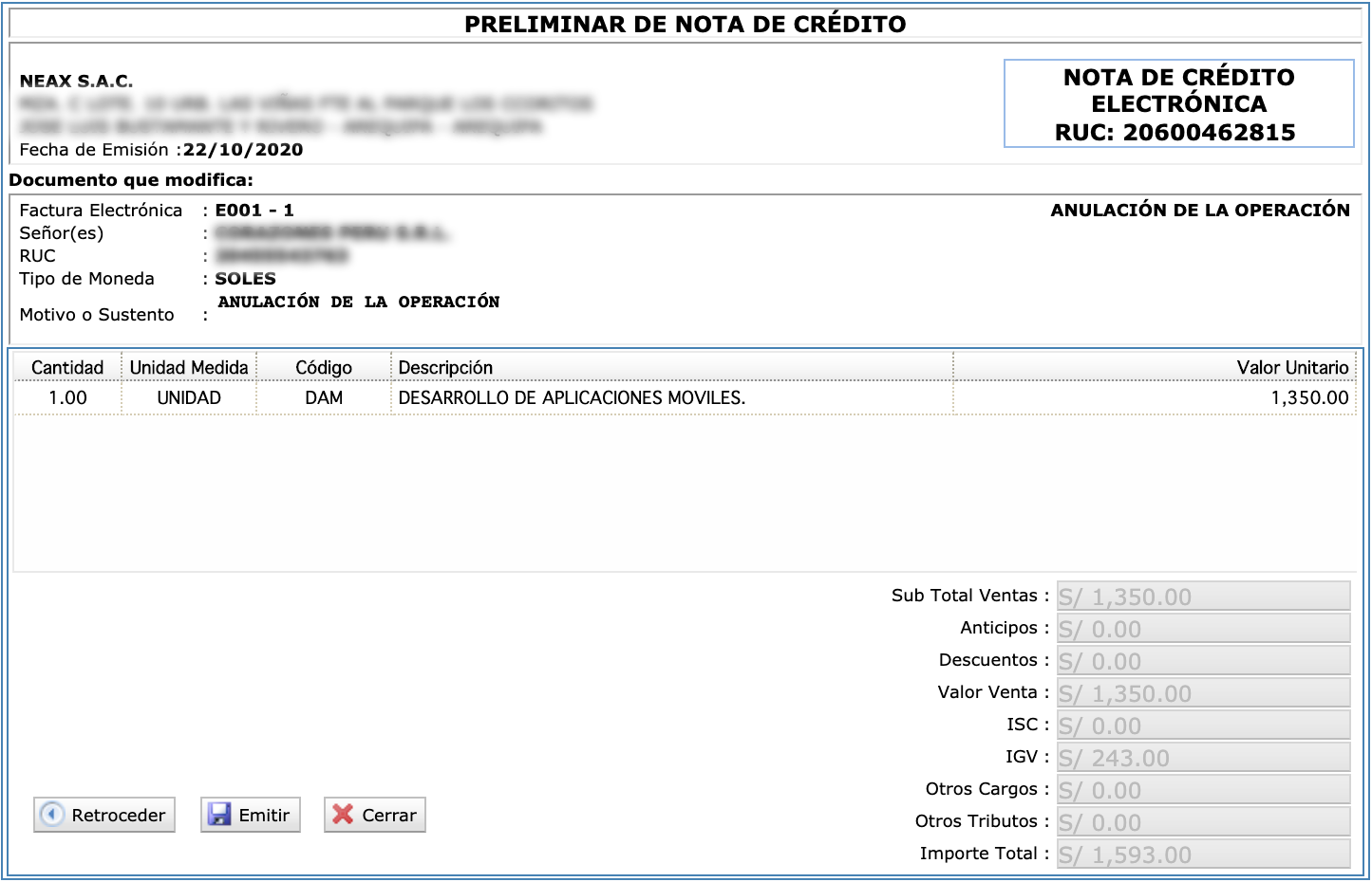 Revisa la nota de crédito preliminar y emítela.