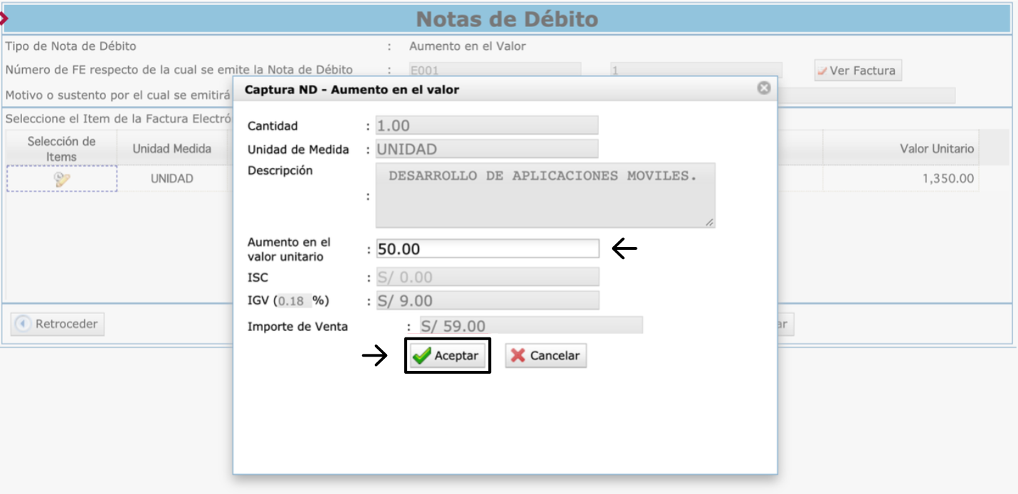 Ya que la nota de débito seleccionada para el ejemplo es por “Aumento en el valor”, agregamos el monto de S/50 (sin incluir IGV) y clic en “Aceptar”.