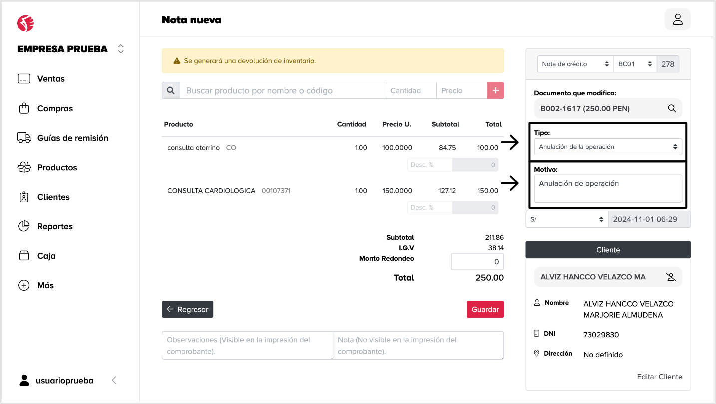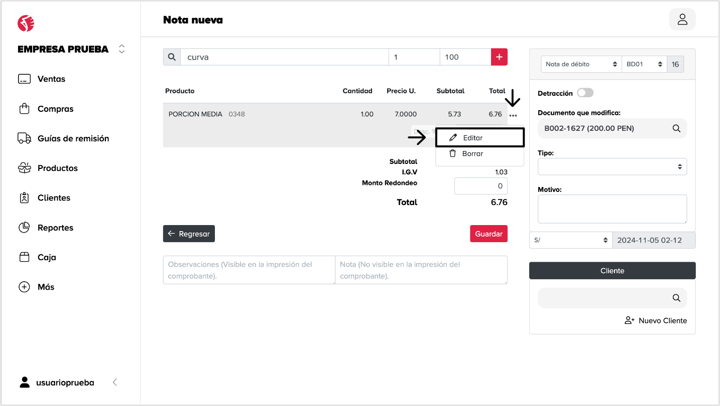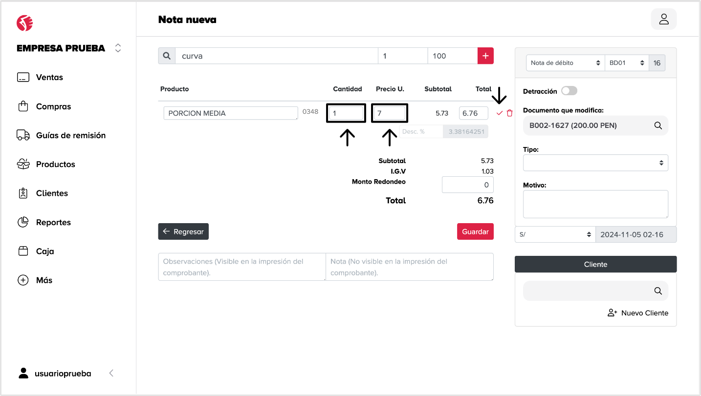 Finalmente, edita la cantidad (incluido IGV) o el precio unitario y da clic en el aspa.