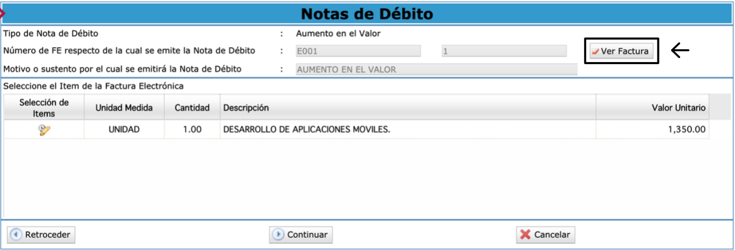 Selecciona el tipo de nota de débito y escribe el número de factura. Para verificar si la factura a modificar es correcta, haz clic en “Ver factura”.
