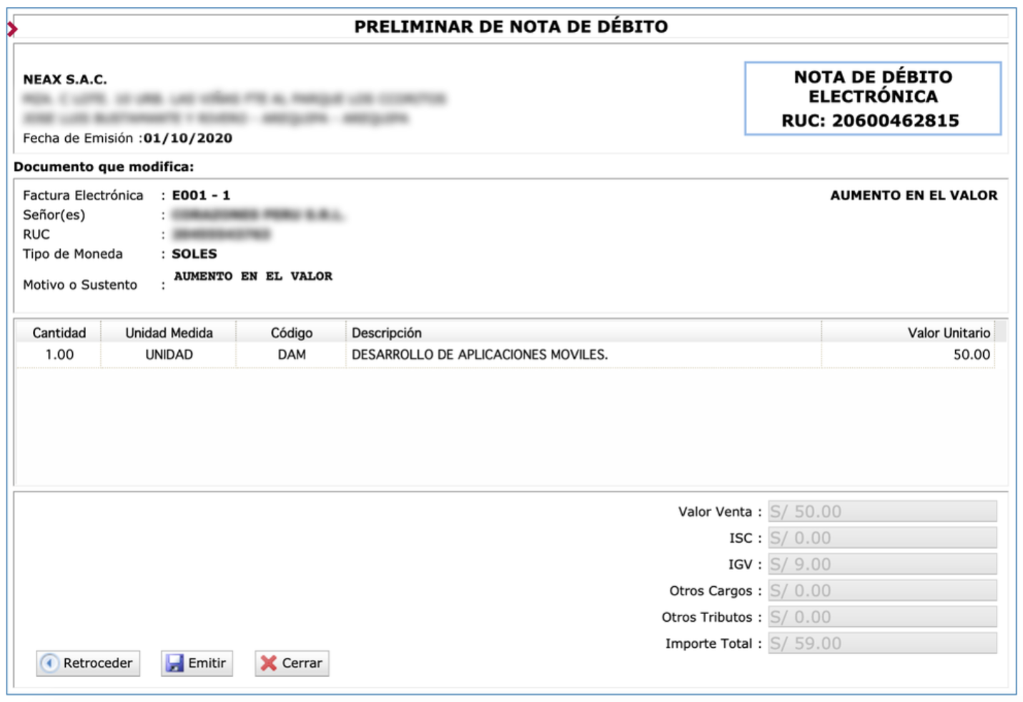 Verás la nota de débito preliminar, verifica los datos y clic en "Emitir". Para finalizar, puedes imprimir o descargar la nota de débito en PDF.