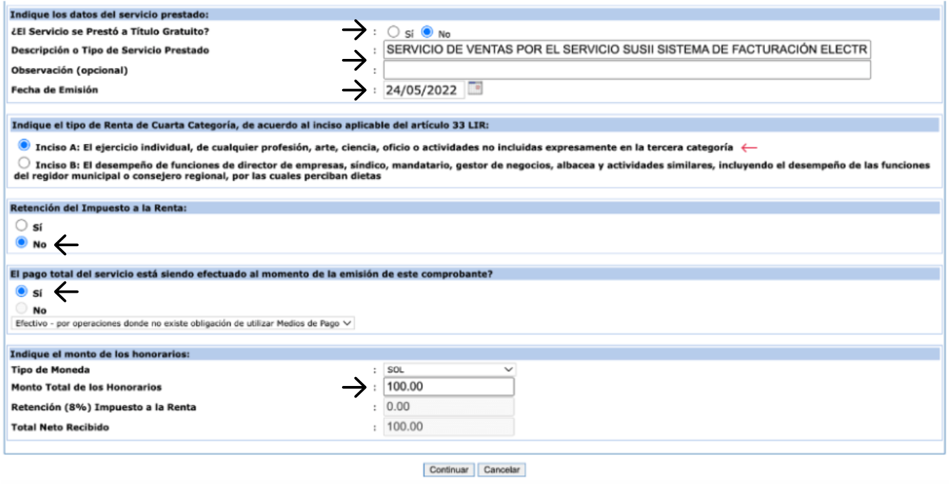 f. Indique si el pago total del servicio está siendo efectuado al momento de la emisión.