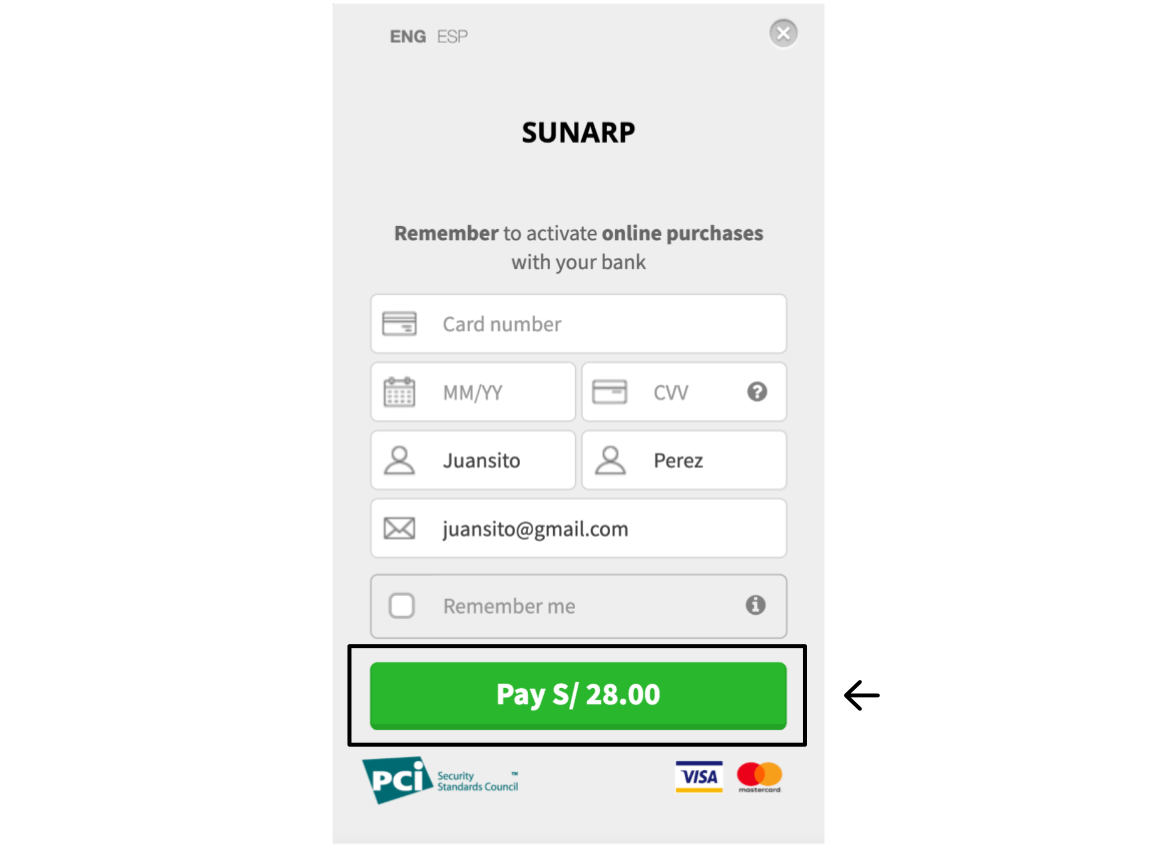 Dale clic al botón azul “Pay Here” (Paga Aquí) para abrir la pasarela de pagos e ingresa los datos de la tarjeta. Finaliza dando clic en “Pagar”.