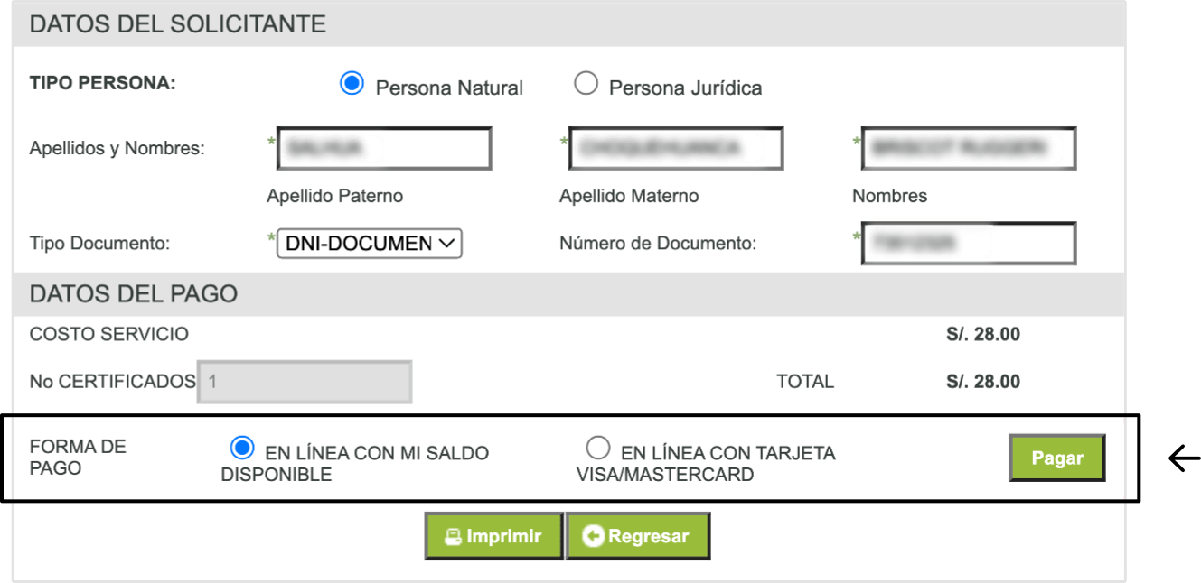 Completa tus datos como solicitante y escoge el método de pago (tarjeta de crédito o debito). En este caso escogeremos la opción “En línea con tarjeta Visa/Mastercad” y luego clic en “Pagar”.