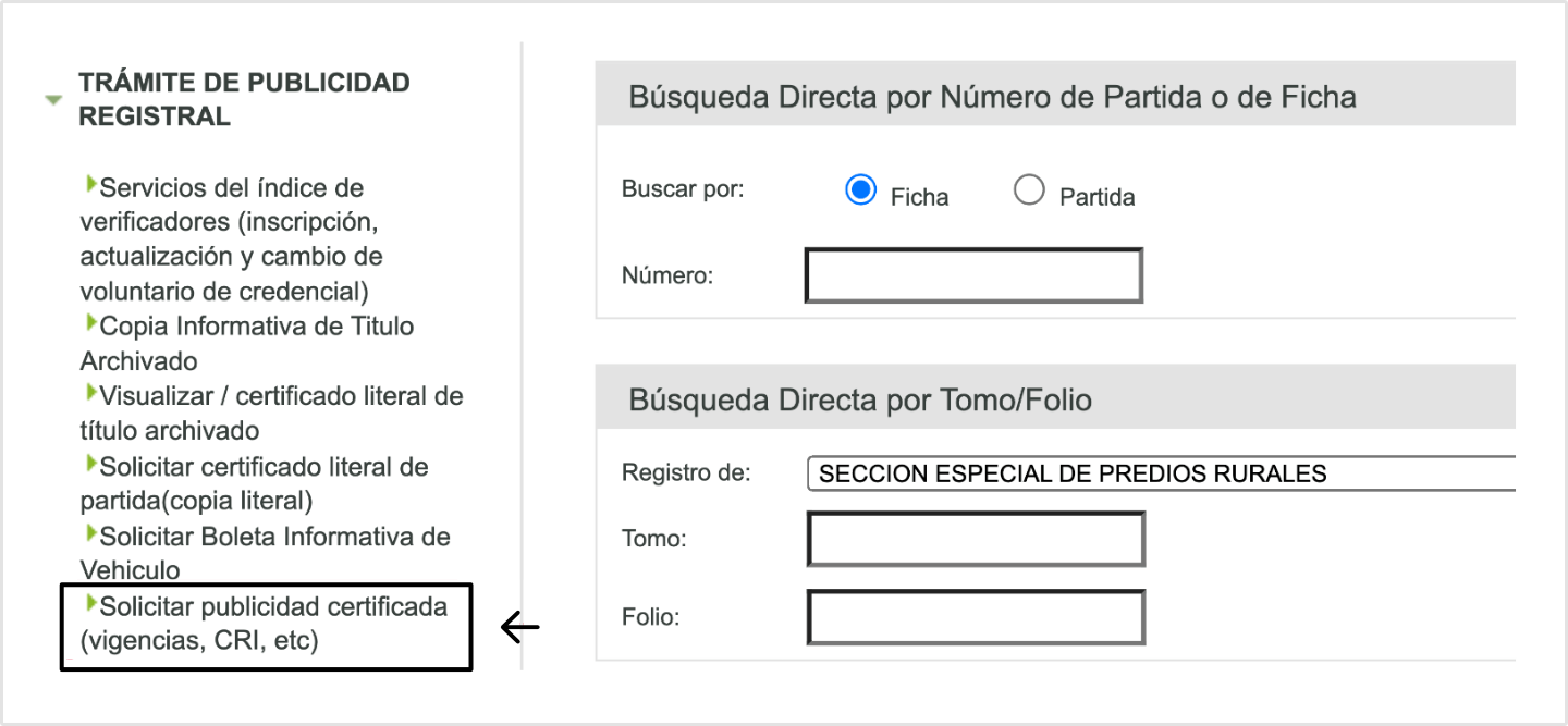 Del listado en la parte izquierda escoge la opción “Solicitar publicidad certificada (vigencias, CRI, etc.)”